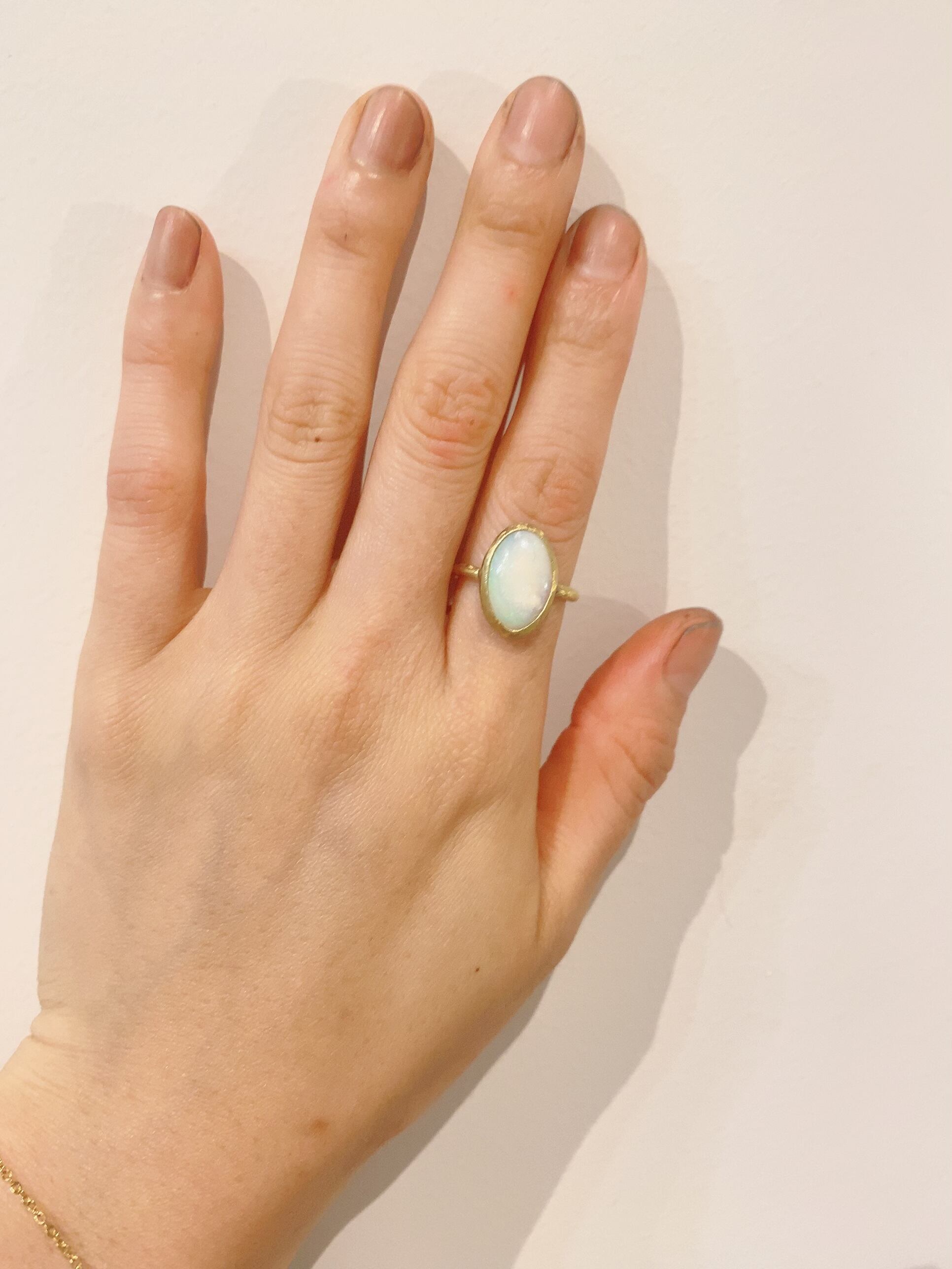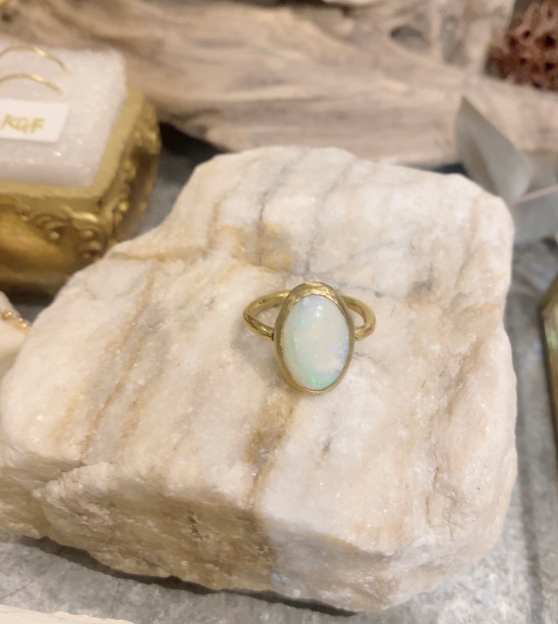 白地に緑に光る大きめのプレシャスオパールを使った真鍮製のリングです。 後ろ側でサイズ調整ができるフリーサイズ(だいたい8号-13号)のリングです。
