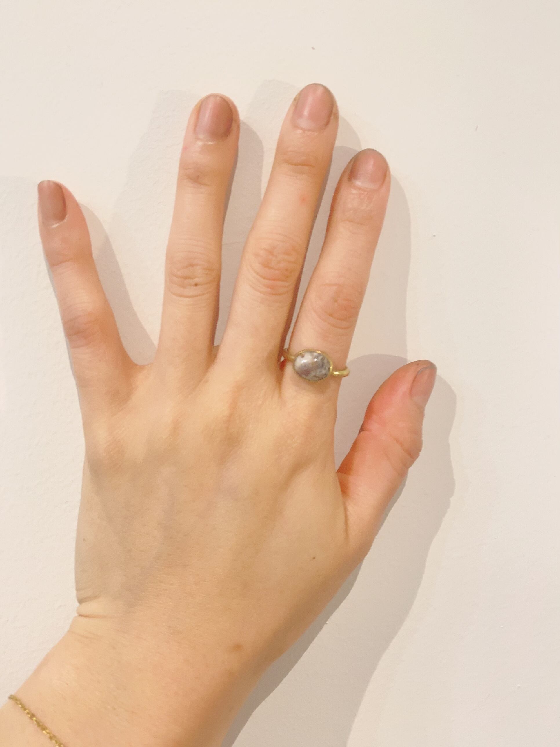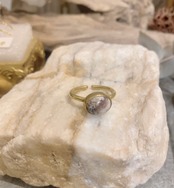 マーブル模様のようなラグナレースアゲートを使った真鍮製のフリーサイズ(だいたい号-13号)のリングです。