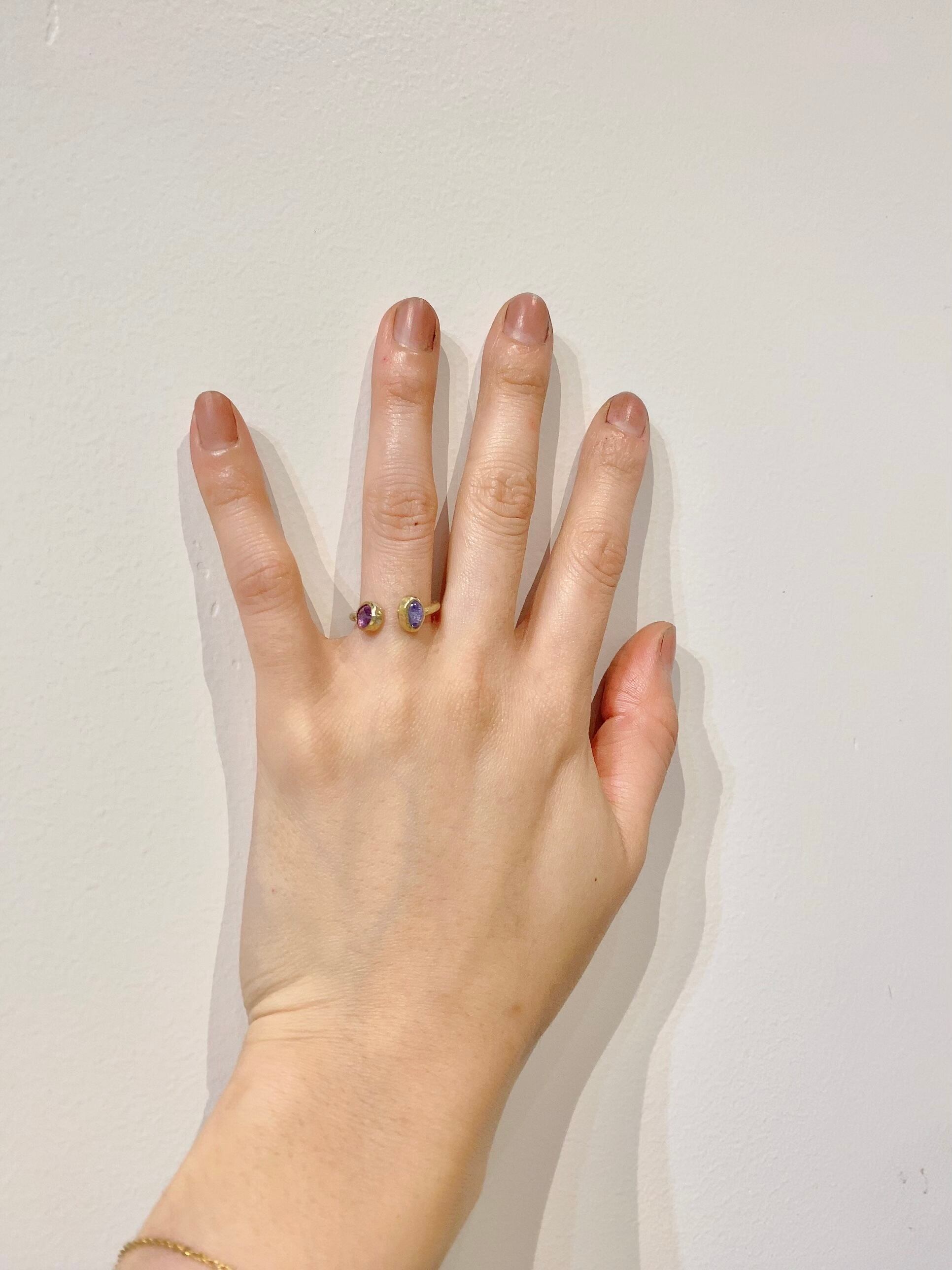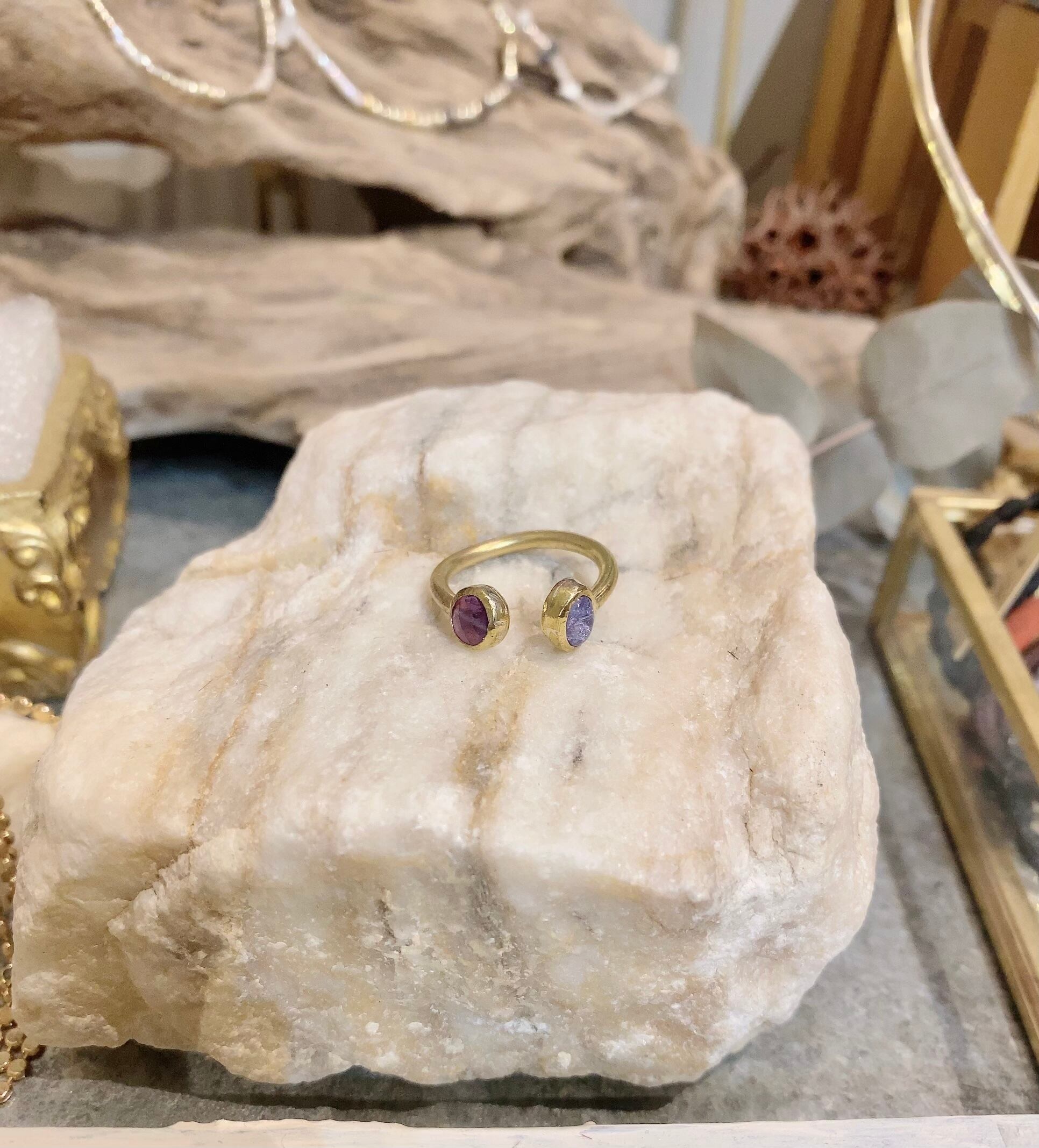 紫色のアメジストとクリアブルーのタンザナイトの石を使った真鍮製のフリーサイズのリングです。見本の写真で8号のバランスとなります。