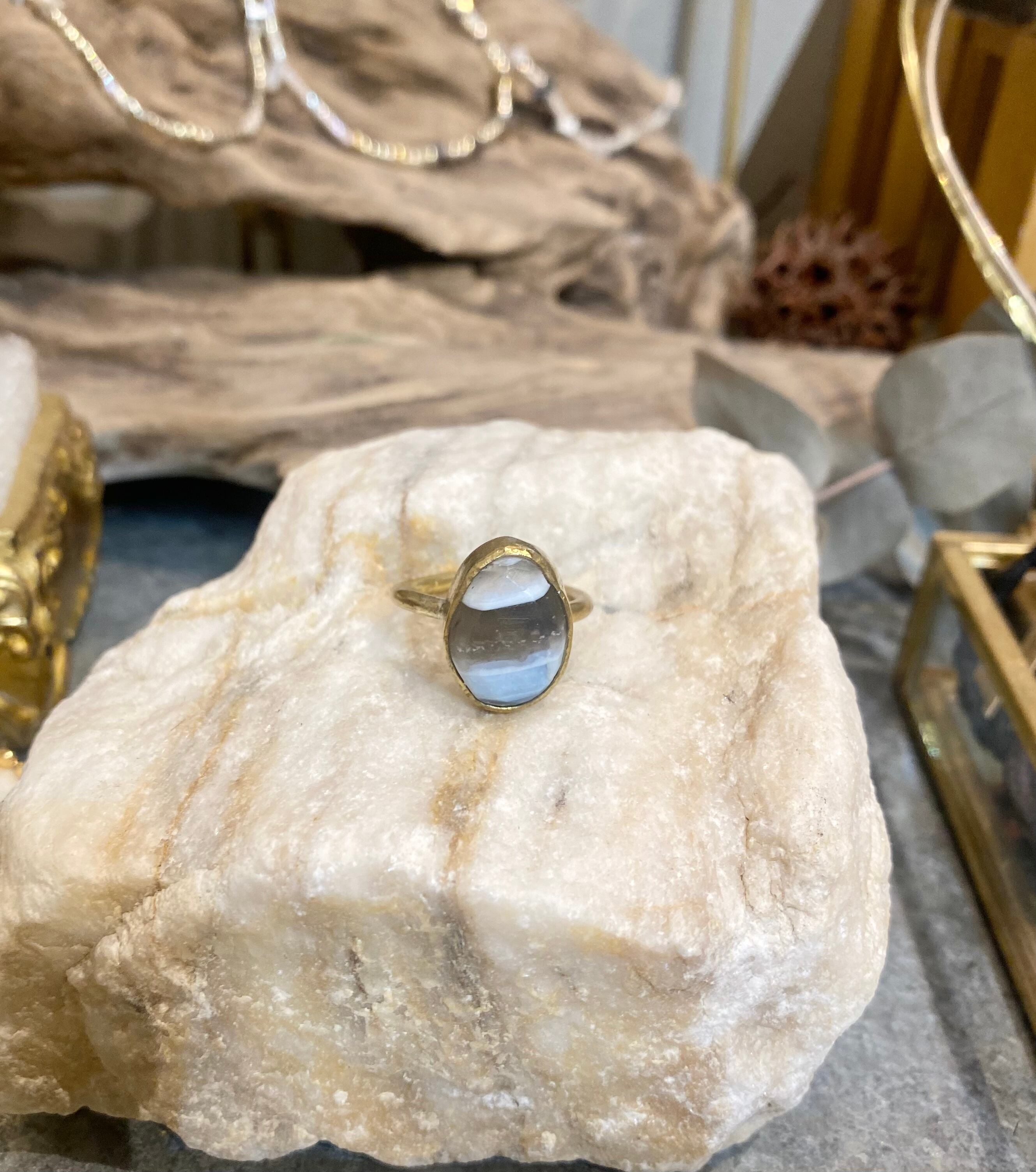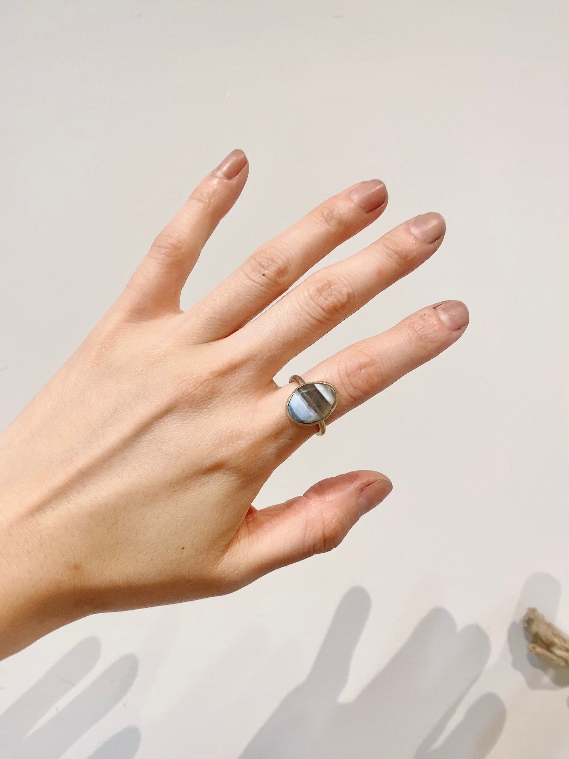 ストライプブルーオパールの石を使った真鍮製のフリーサイズ(だいたい8号〜13号)のリングです。